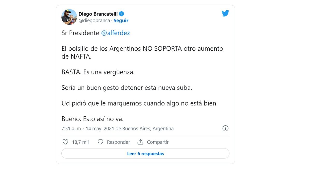 "Sr Presidente @alferdez. El bolsillo de los Argentinos NO SOPORTA otro aumento de NAFTA. BASTA. Es una vergüenza", indicó el periodista.