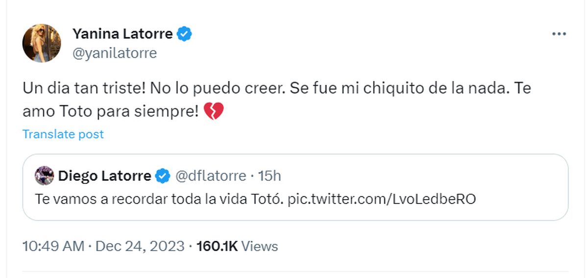 Por su parte, la panelista de LAM (América TV), escribió desde Twitter: "¡Un día tan triste! No lo puedo creer. Se fue mi chiquito de la nada. Te amo, Toto, para siempre!".