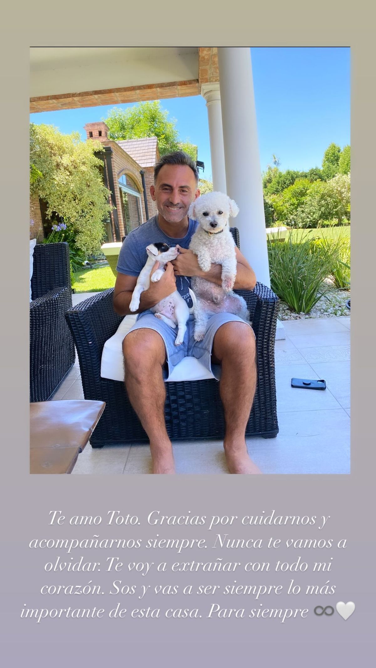 "Hoy se fue inesperadamente Totó, mi mejor amigo, mi compañero leal y silencioso que estuvo a mi lado desde hace 15 años. Me gustaría recordarlo con alegría y siento que tengo que agradecerle por todo el amor que me dio pero el dolor es muy grande. Una parte de mi vida se fue con él. Te voy a amar para siempre. Jamás, pero jamás, te voy a olvidar", escribió muy emocionado Diego.