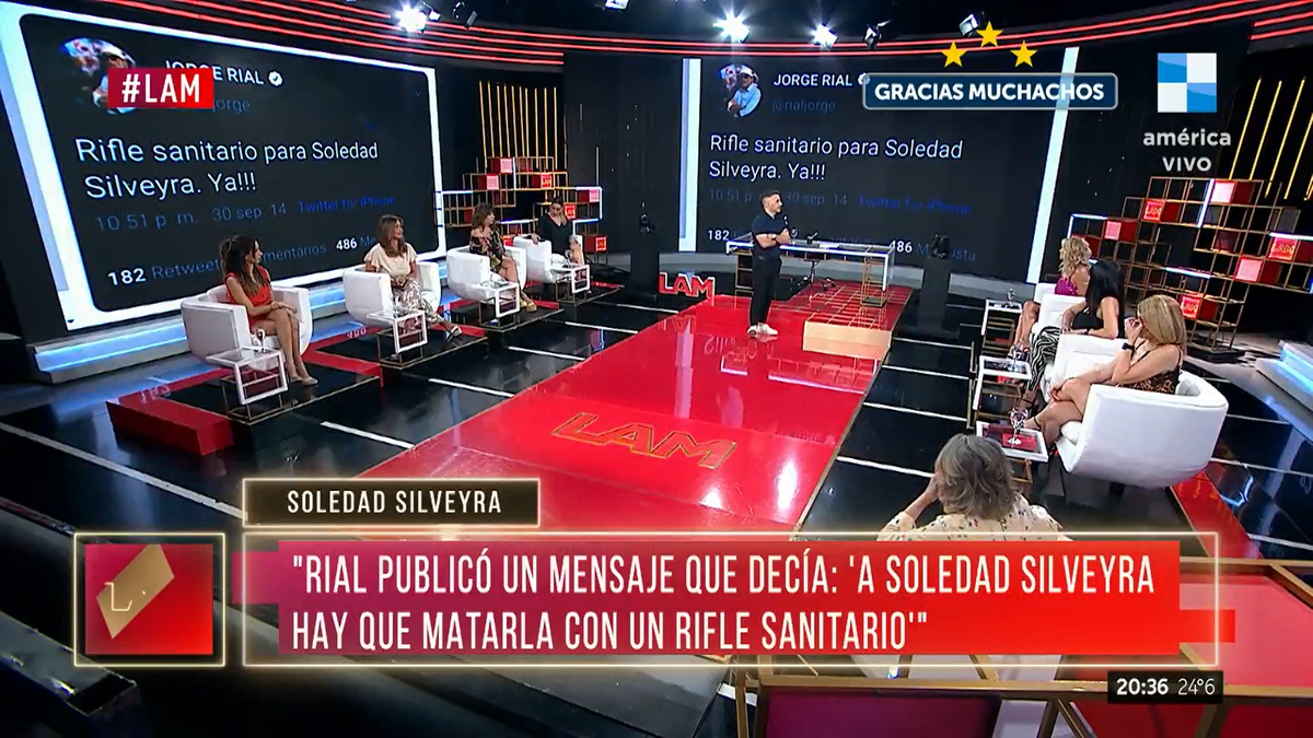 Ese comentario de Solita no fue del agrado de Rial. "Publicó un tuit que decía: 'A Soledad Silveyra hay que matarla con un rifle sanitario'. Entonces, dije: '¿qué es un rifle sanitario?'. Lo fui a buscar y 'un rifle sanitario' es un rifle que se usa para matar a animales que tienen peste. ¡Fue excesivo!", sostuvo.