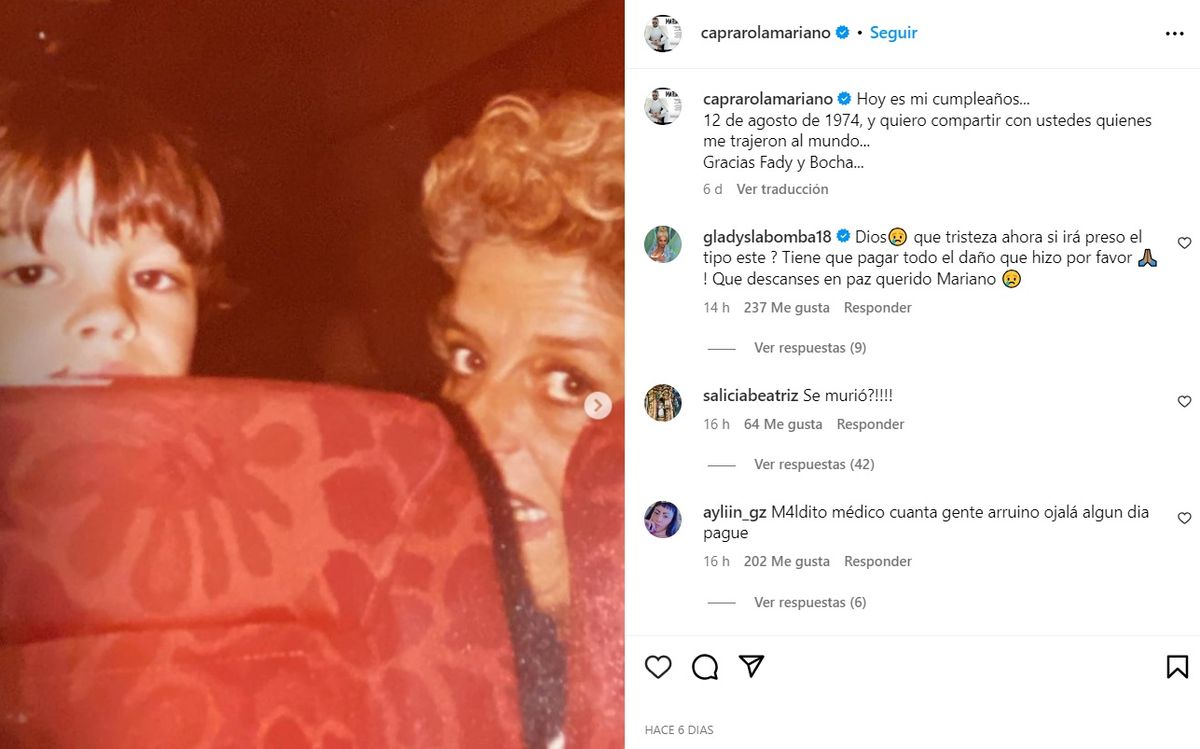 Hace unos días, desde su cuenta de Instagram, Mariano Caprarola dejaba su último posteo dedicado a su mamá y papá en un día especial para él.