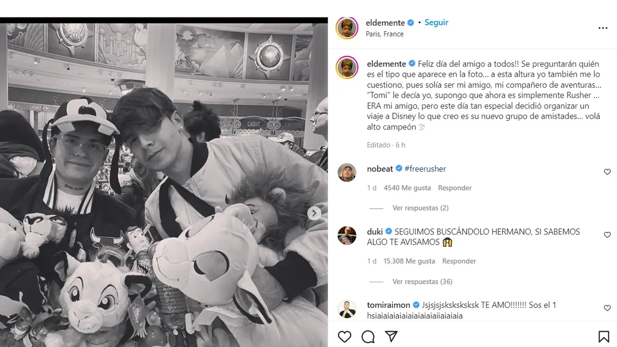 Y añadió: "Tomi le decía yo, supongo que ahora es simplemente Rusher. ERA mi amigo, pero en este día tan especial decidió organizar un viaje a Disney con el que creo que es su nuevo grupo de amigos…".