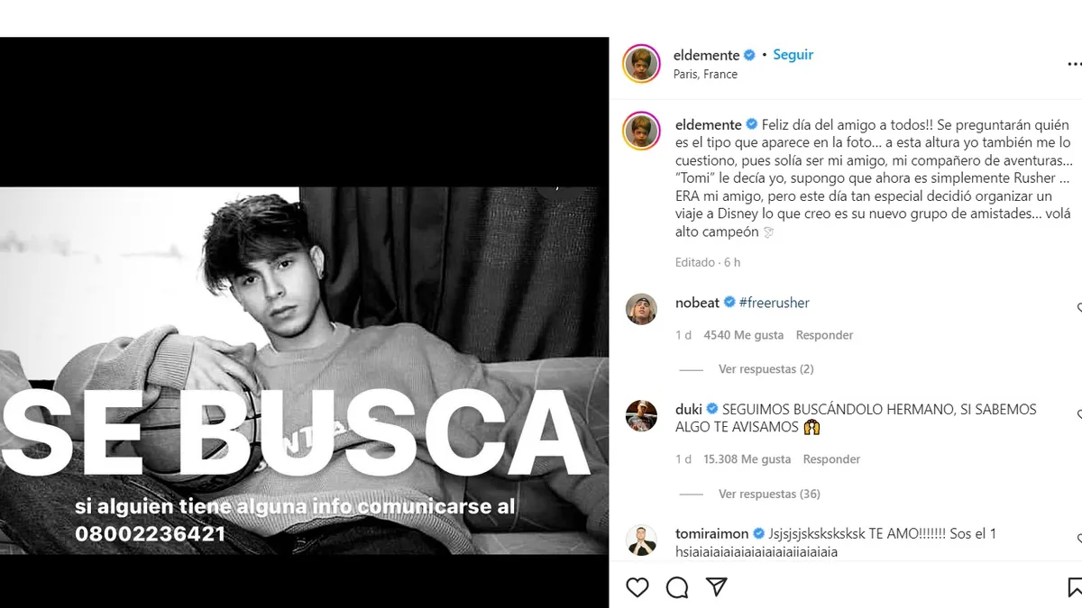 El Duki por su parte comentó también la publicación, sumándose el mensaje: "Seguimos buscándolo hermano, si sabemos de algo te avisamos".
