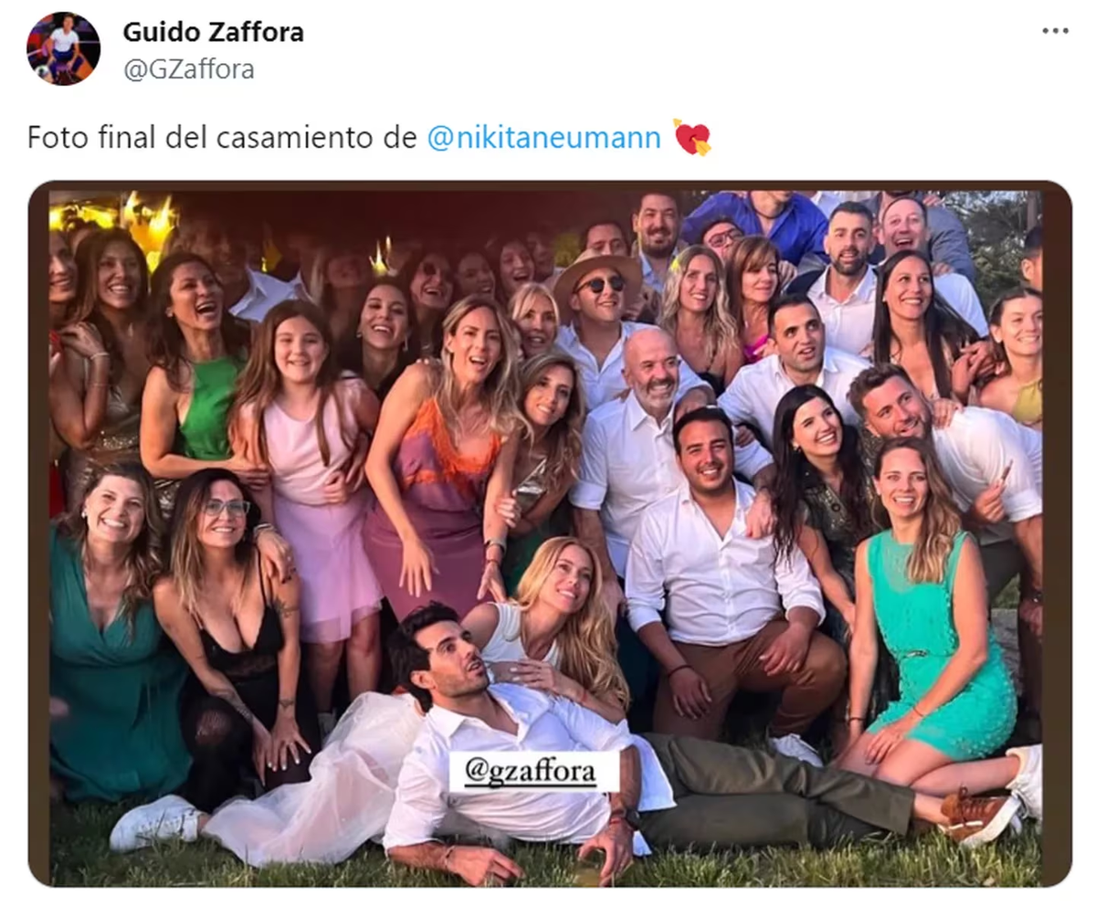“Final de fiesta”, escribió el periodista Guido Záffora en un tuit donde el flamante matrimonio aparece sonriente y rodeado por todos los invitados al evento.
