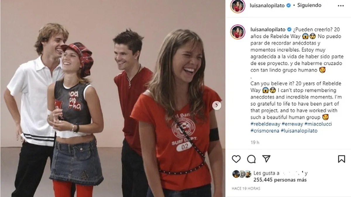 "¿Pueden creerlo? 20 años de Rebelde Way... No puedo parar de recordar anécdotas y momentos increíbles. Estoy muy agradecida a la vida de haber sido parte de ese proyecto, y de haberme cruzado con tan lindo grupo humano" posteó desde su redes sociales Lopilato, junto a dos emojis de asombro por el inexorable paso del tiempo y a la vez emoción por todo lo vivido.
