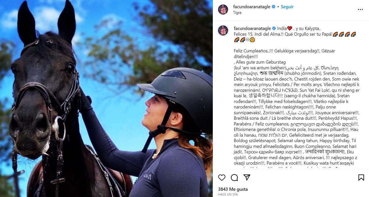 "India y su Kalypta... Felices 15 años, Indi del alma... Qué orgullo ser tu papá... Feliz cumpleaños", expresó el actor en su cuenta en la red social junto a una foto de su hija practicando equitación, deporte que la apasiona.