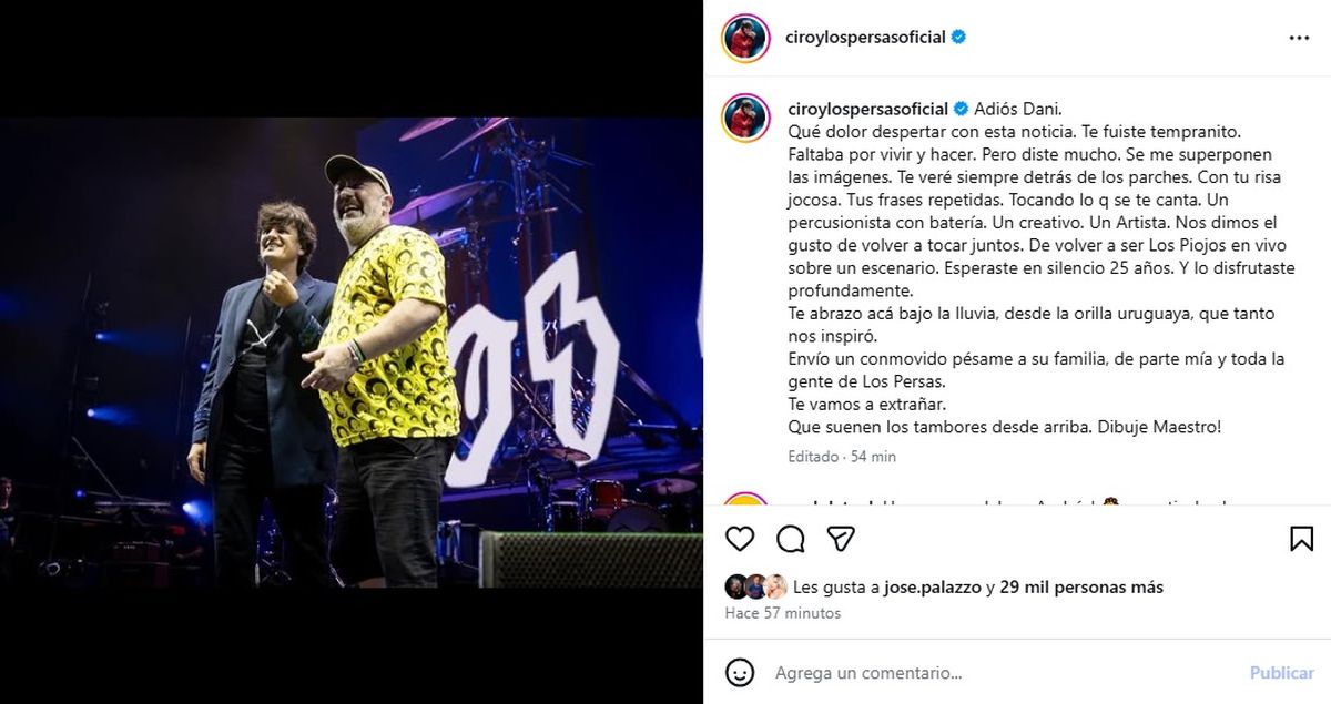 Ya avanzada la mañana, Andrés Ciro Martínez recurrió a sus redes sociales para dedicarle unas palabras cargadas de emoción. “Adiós Dani. Qué dolor despertar con esta noticia. Te fuiste tempranito. Faltaba por vivir y hacer. Pero diste mucho”, escribió el cantante, quien por estos días se encontraba en Uruguay presentándose con su proyecto Los Persas.