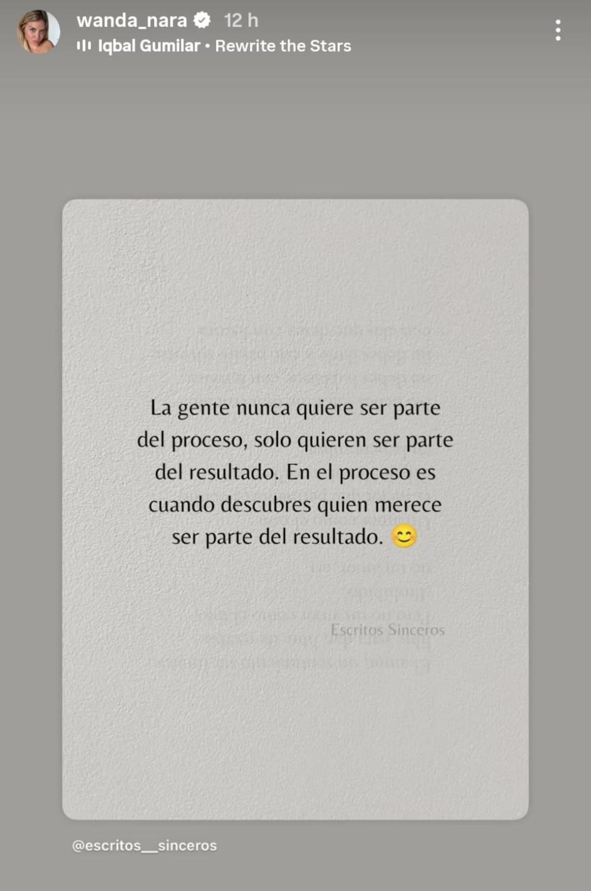 La historia que publicó Wanda mostró una imagen de fondo gris, sobria y minimalista, acompañada por una frase reflexiva que invitó a la especulación.“La gente nunca quiere ser parte del proceso, solo quieren ser parte del resultado. En el proceso es cuando descubrís quién merece ser parte del resultado”, decía el texto, que cerraba con un emoji sonriente. Un detalle que no pasó desapercibido entre sus seguidores fue que la frase pertenece a la cuenta @escritos__sinceros, conocida por compartir mensajes introspectivos y cargados de significado emocional.