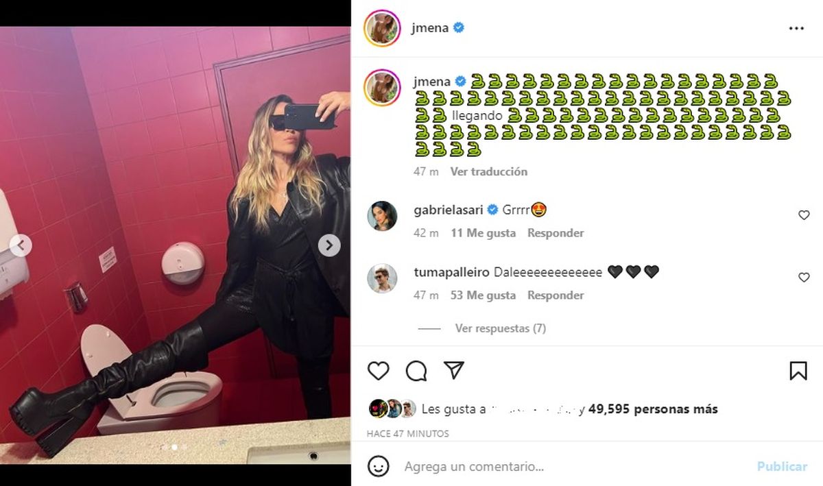 Pero como nada es eterno, ya de regreso en Buenos Aires, Jimena Barón de a poco comenzó a retomar sus actividades de cara a lo que sería el próximo lanzamiento de sus nuevas canciones. Por eso este viernes volvió a mostrarse sexy y provocadora desde su cuenta de Instagram desde un baño con paredes y puerta roja, y artefactos blancos; mientras que ella está vestida con un total black. Allí sólo escribió la palabra "Llegando" junto a muchos emojis de serpientes, en clara referencia a La Cobra, su máximo hit.