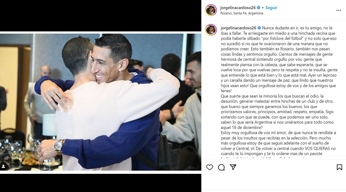 "Cientos de mensajes de gente hermosa de central sintiendo orgullo por vos, gente que realmente piensa con la cabeza, que sabe esperarte, que se vuelve loca por que vuelvas pero te respeta y no te insulta, gente que entiende lo que está bien y lo que está mal. Ayer un leproso y un canalla dando un mensaje de paz, que lindo que nuestros hijos vean esto! Que orgullosa estoy de vos y de los amigos que tenes!", agregó.