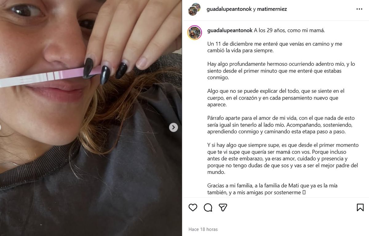 "A los 29 años, como mi mamá. Un 11 de diciembre me enteré que venías en camino y me cambió la vida para siempre. Hay algo profundamente hermoso ocurriendo adentro mío, y lo siento desde el primer minuto que me enteré que estabas conmigo", comenzó Guadalupe Antón su mensaje.