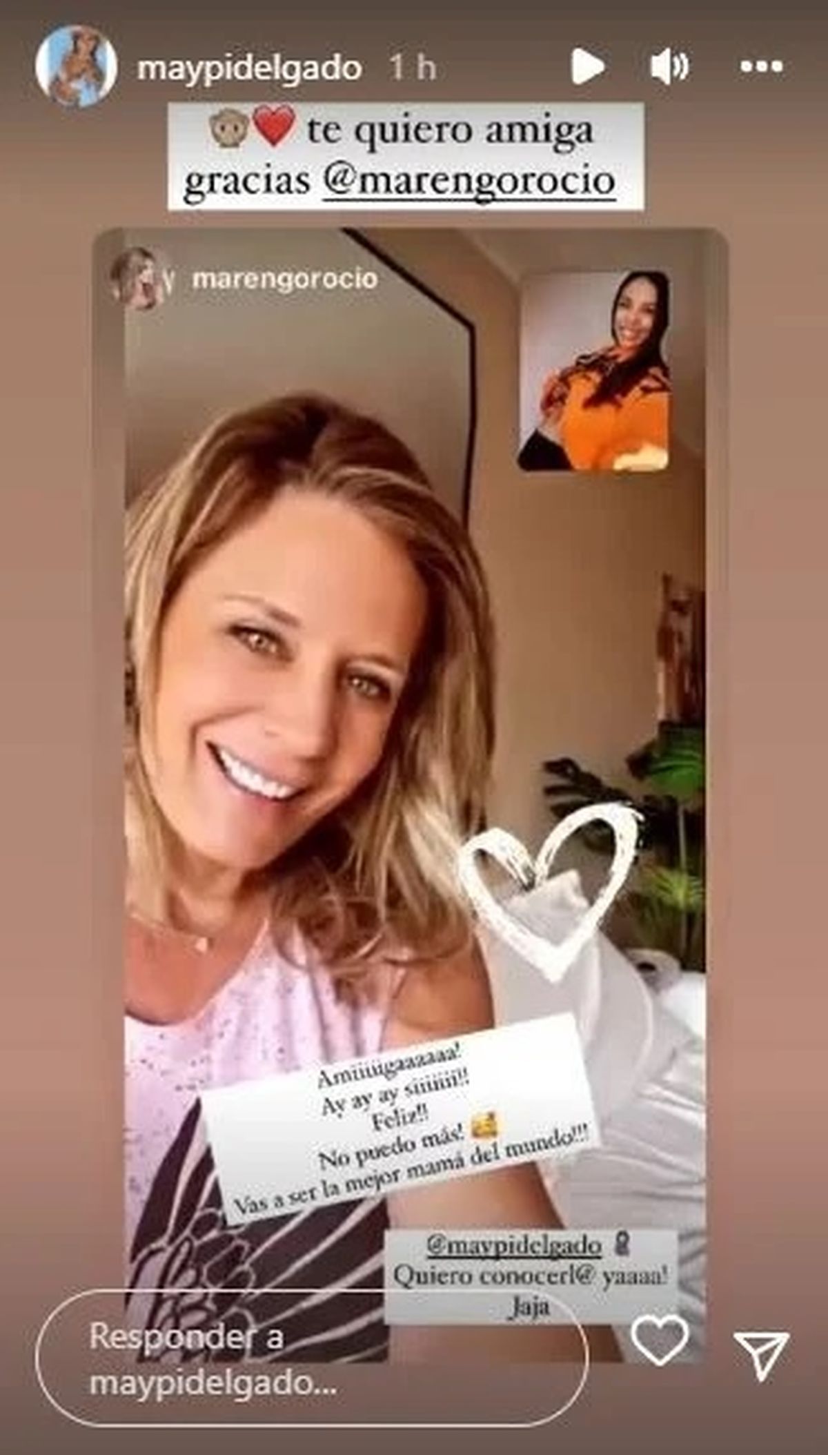 Rocío Marengo le dedicó un dulce posteo a su amiga en Instagram stories, en el que se las ve haciendo una videollamada y a Delgado mostrando su pancita en crecimiento. "Amiga, ¡ay, ay, ay, sí! ¿Feliz? ¡No puedo más! Vas a ser la mejor mamá del mundo. Quiero conocerlo@ ya", escribió Rocío, emocionada por la maternidad de Maypi.