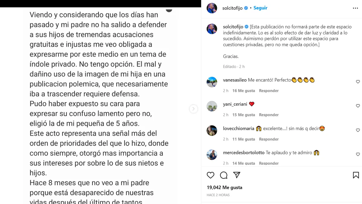 Sol cuestionó la publicación de su padre: "El mal y dañino uso de la imagen de mi hija en una publicación polémica, que necesariamente iba a trascender, quiere defensa. Puedo haber expuesto su cara para expresar su confuso lamento, pero no, eligió la de mi pequeña, de 5 años".