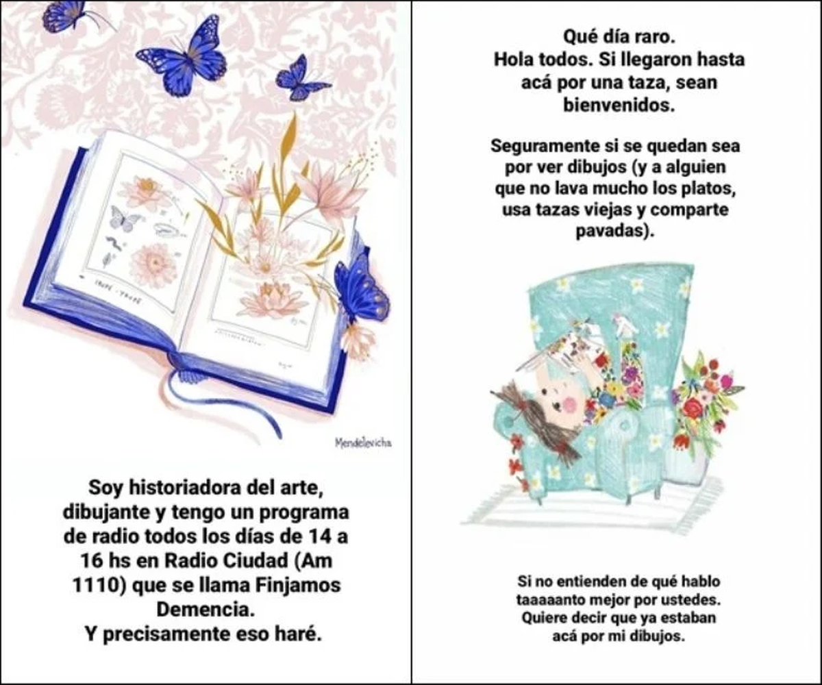 En otro posteo, Mendelevich escribió: "Soy historiadora del arte, dibujante y tengo un programa de radio que se llama 'Finjamos demencia' y precisamente, eso haré".