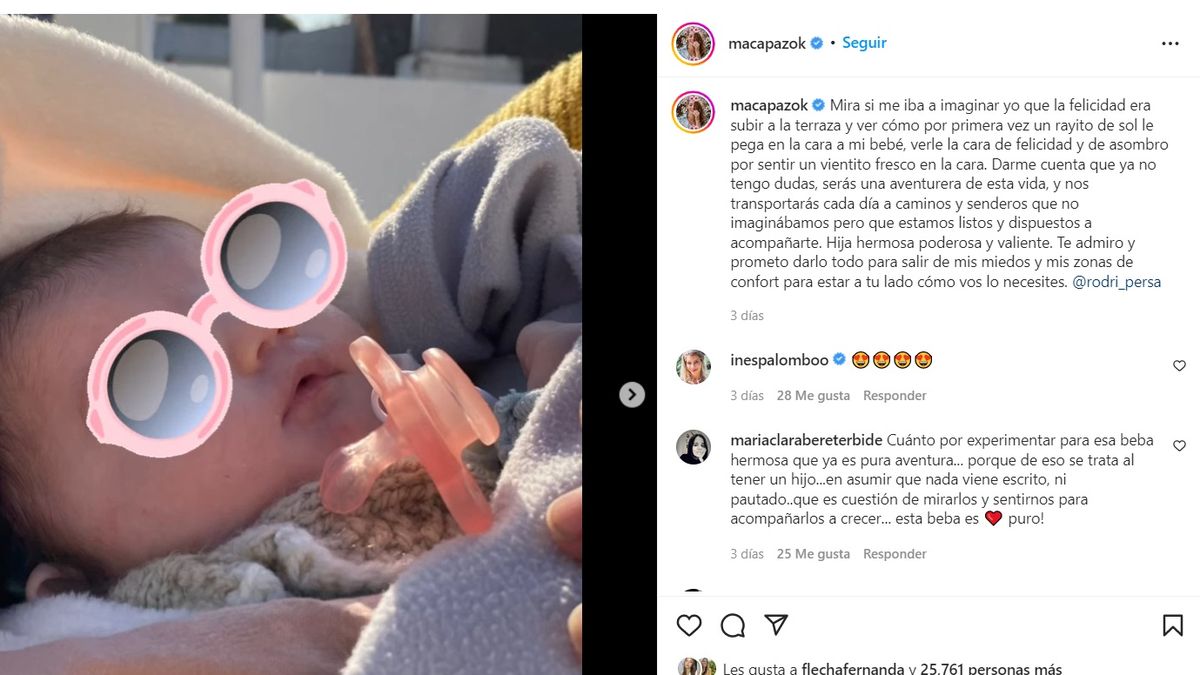 "Mirá si me iba a imaginar yo que la felicidad era subir a la terraza y ver cómo por primera vez un rayito de sol le pega en la cara a mi bebé, verle la cara de felicidad y de asombro por sentir un vientito fresco en la cara", reflexionó Macarena Paz.