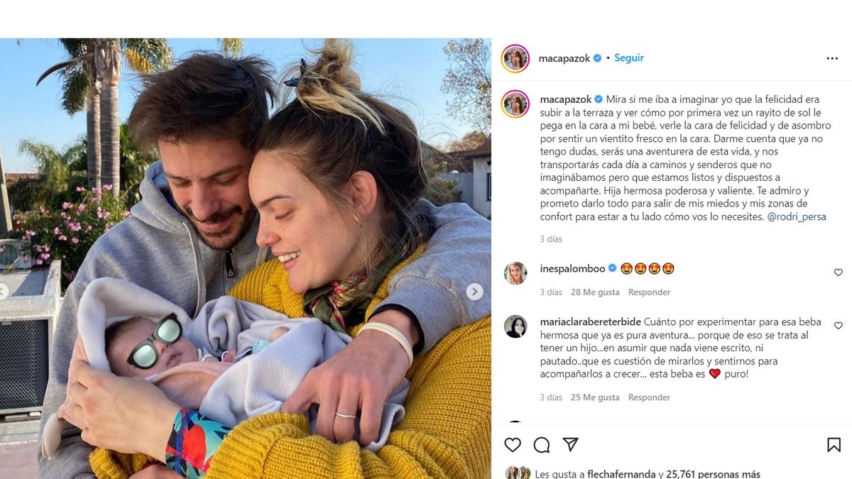 La actriz Macarena Paz compartió un emotivo posteo en Instagram después de subir por primera vez a la terraza con su hija Abril y su pareja y que la beba reciba por primera vez los rayos del sol tras el alta médica.