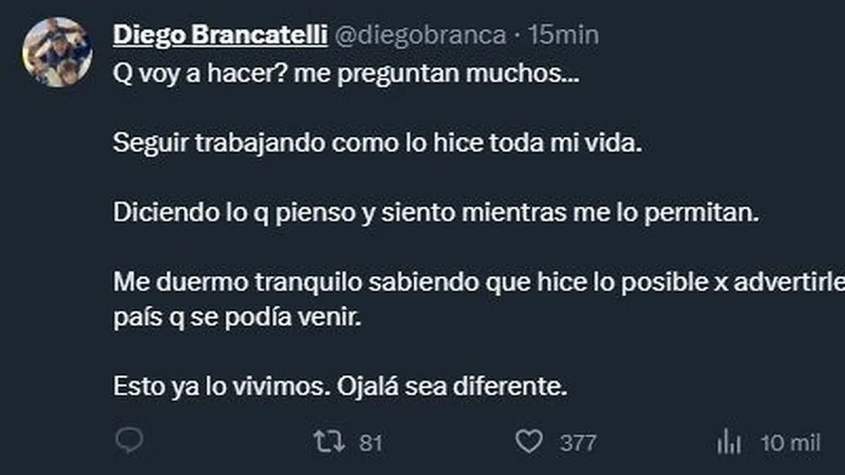 A través de su cuenta de X (ex Twitter), Brancatelli, conocido por su apoyo al anterior candidato, dejó entrever su descontento con el resultado, manifestando: "¿Qué voy a hacer? Me preguntan muchos. Seguir trabajando como lo hice toda mi vida. Diciendo lo que pienso y siento mientras me lo permitan".