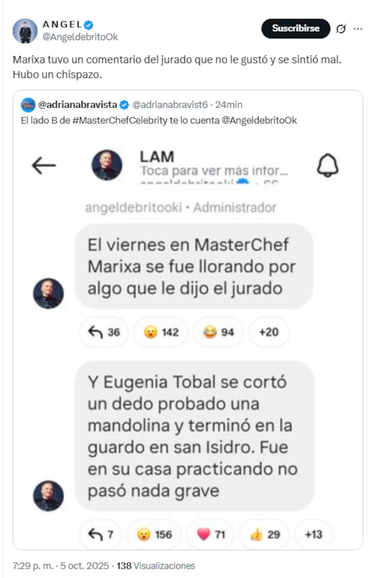 “El viernes en MasterChef Marixa (Balli) se fue llorando por algo que le dijo el jurado”, reveló Ángel de Brito a través de sus redes sociales durante el fin de semana.