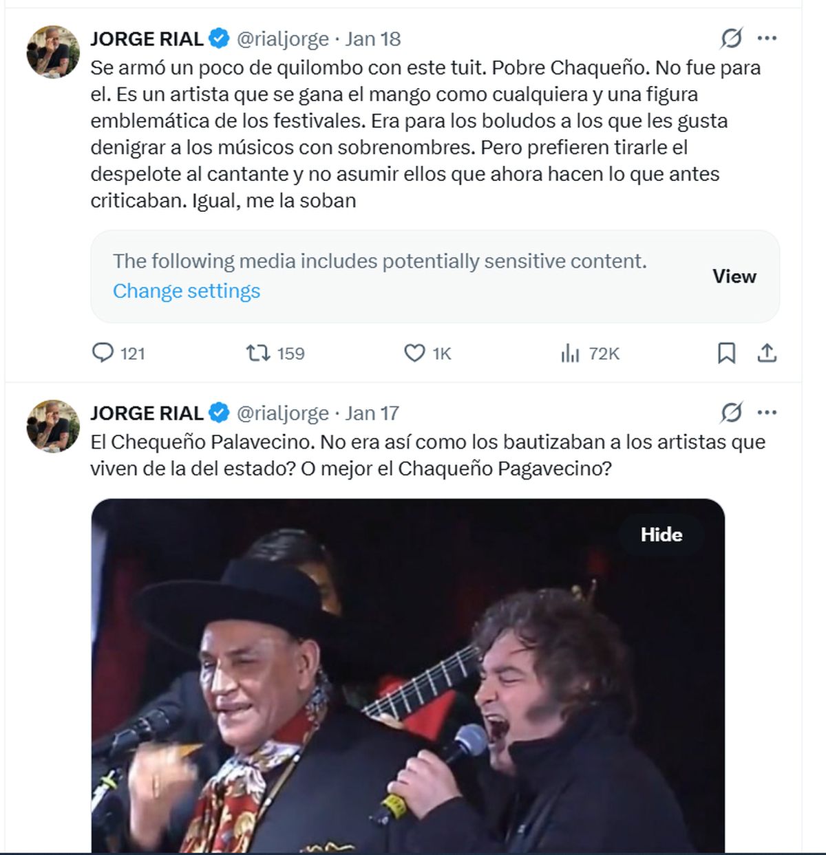 Por último, Rial optó por bajar el tono de la discusión y aclaró su postura con un nuevo mensaje en redes: “Se armó un poco de quilombo con este tuit. Pobre Chaqueño. No fue para el. Es un artista que se gana el mango como cualquiera y una figura emblemática de los festivales. Era para los boludos a los que les gusta denigrar a los músicos con sobrenombres. Pero prefieren tirarle el despelote al cantante y no asumir ellos que ahora hacen lo que antes criticaban. Igual, me la soban”.