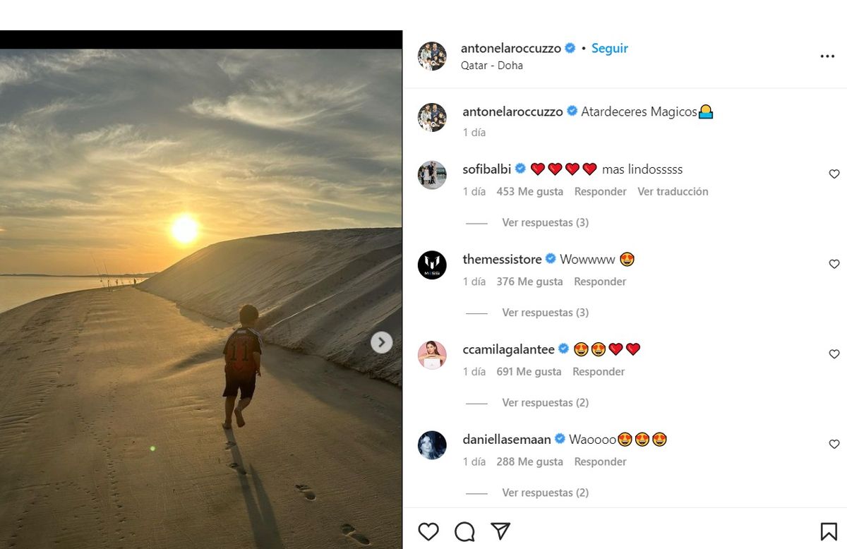 Y luego, desde las playas qataríes, Antonela mostró el hermoso paisaje que ofrece Doha en compañía de sus tres hijos: "Atardeceres mágicos", comentó.