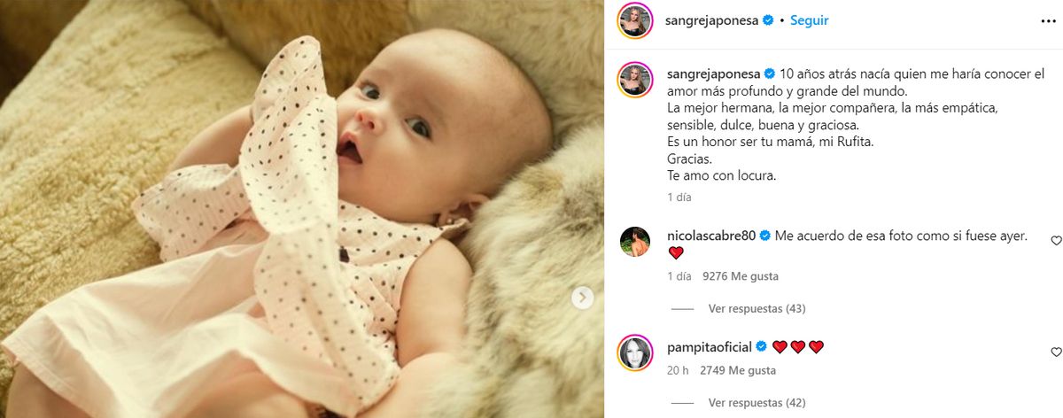 “Es un honor ser tu mamá, mi Rufita. Gracias. Te amo con locura”, había cerrado el mensaje que incluía una serie de fotos de su hija, fruto de su relación con Nicolás Cabré.
