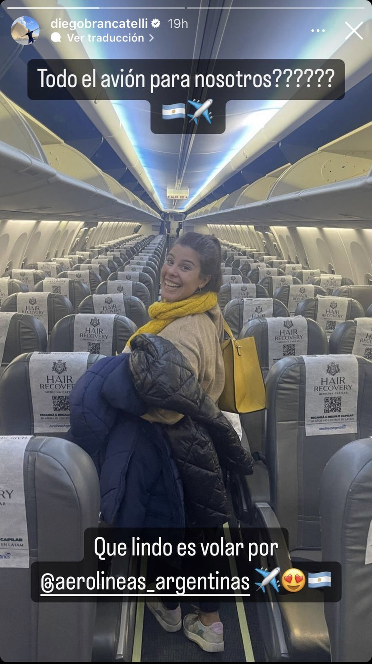En su cuenta de Instagram, Brancatelli colgó una imagen del avión, en donde aparece su mujer, la movilera de TN Cecilia Insinga, y escribió: "¿Todo el avión para nosotros? Que lindo es volar por @aerolineas_argentinas".