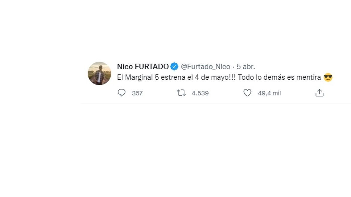 En medio de la andanada de rumores de separación, Nicolás Furtado se volcó a Twitter para aclarar la fecha de estreno de El Marginal 5 y de pasó aprovechó para tirar un palito ante los trascendidos de crisis con su novia.