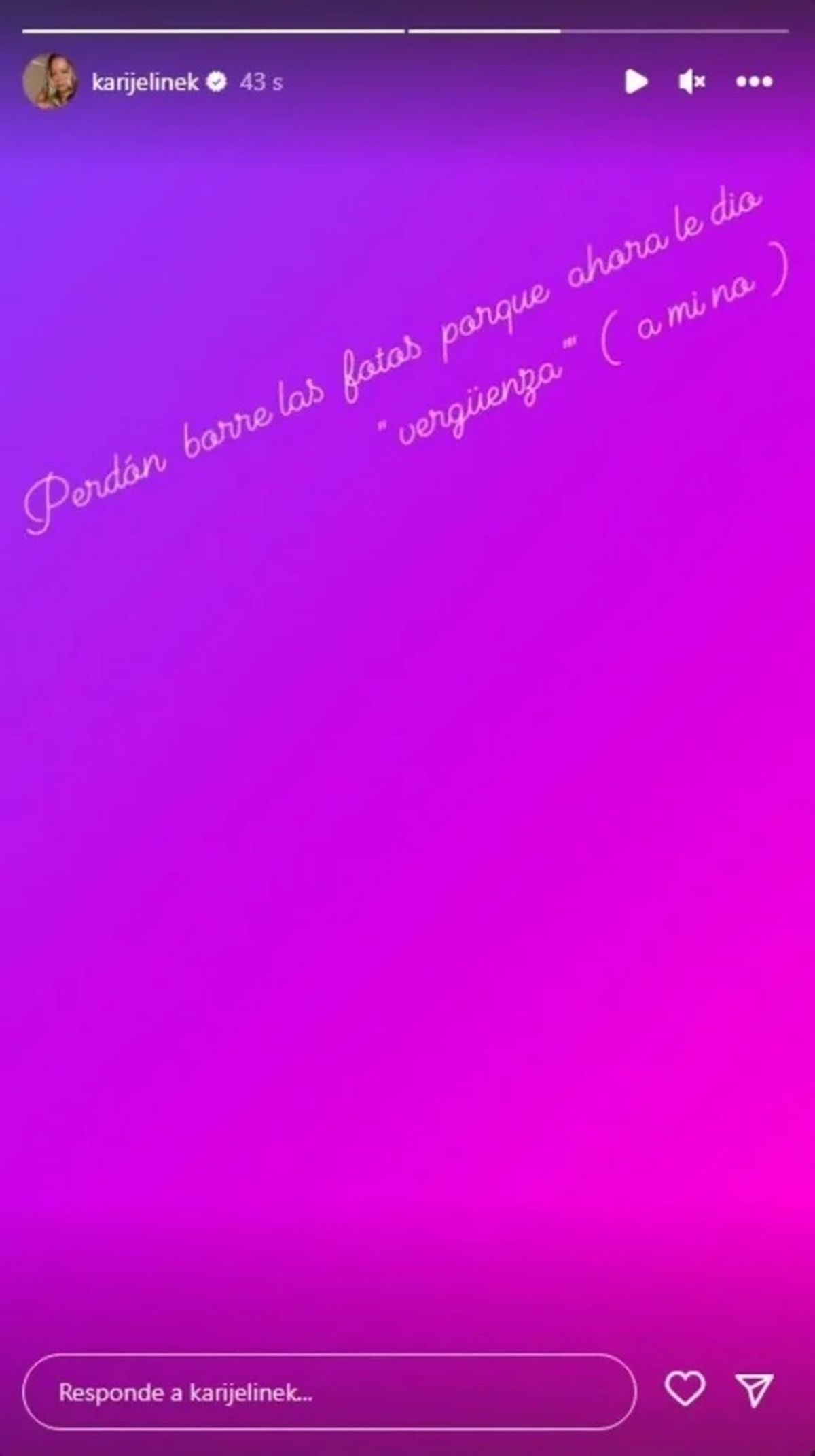 "Perdón borré las fotos porque ahora le dio vergüenza (a mí no)", explicó luego Jelinek sobre el pedido que le hizo su novia tras compartir en público esa foto.