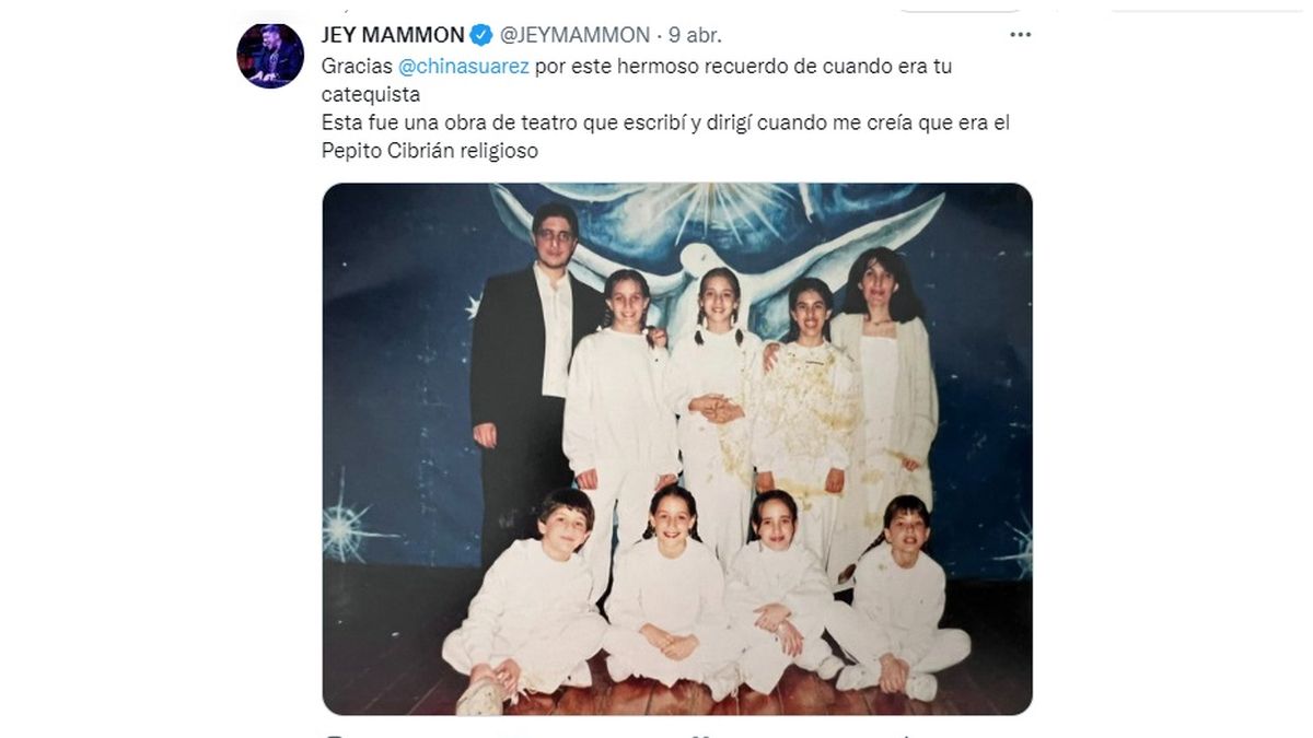 “Gracias China Suárez por este hermoso recuerdo de cuando era tu catequista. Esta fue una obra de teatro que escribí y dirigí cuando me creía que era el Pepito Cibrián religioso”, aclaró el conductor, que dio clases de catequesis en la escuela primaria.
