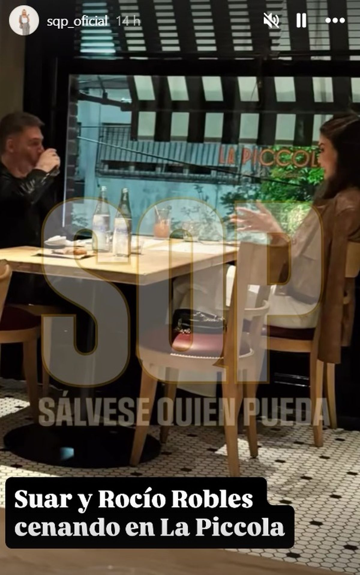 "Suar y Rocío Robles cenando en La Piccola", se precisó en la foto subida a redes sociales del ciclo conducido por Yanina Latorre donde se los ve a los dos tomando agua y charlando distendidos frente a la ventana del local gastronómico.