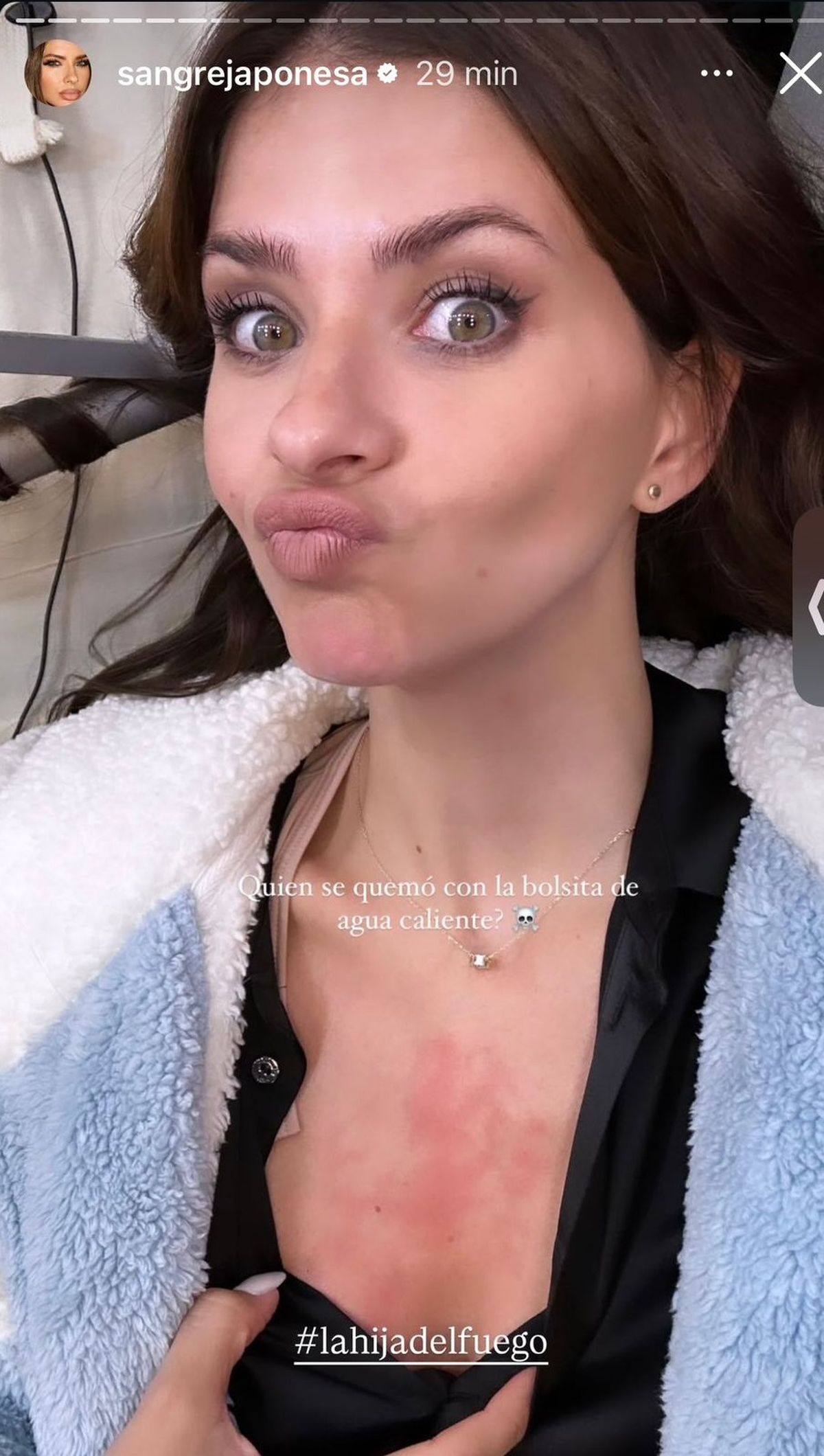 Entre los más impactantes, puede verse el momento que, con cara de resignación, se fotografió con una importante quemadura en el pecho. Fotografía que por estas horas compartió con su fandom a la que le agregó : "¿Quién se quemó con la bolsita de agua caliente? #lahijadelfuego", junto a un emoji de una calavera.