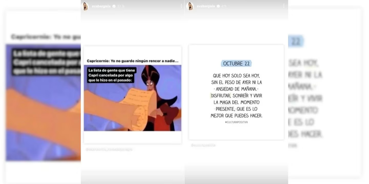 Finalmente, en otra publicación, Eva dejó una profunda reflexión, más que sugestiva. “Octubre 22. Que hoy solo sea hoy, sin el peso de ayer ni la ansiedad de mañana. Disfrutar, sonreír y vivir la magia del momento presente, que es lo mejor que puedes hacer”, escribió.