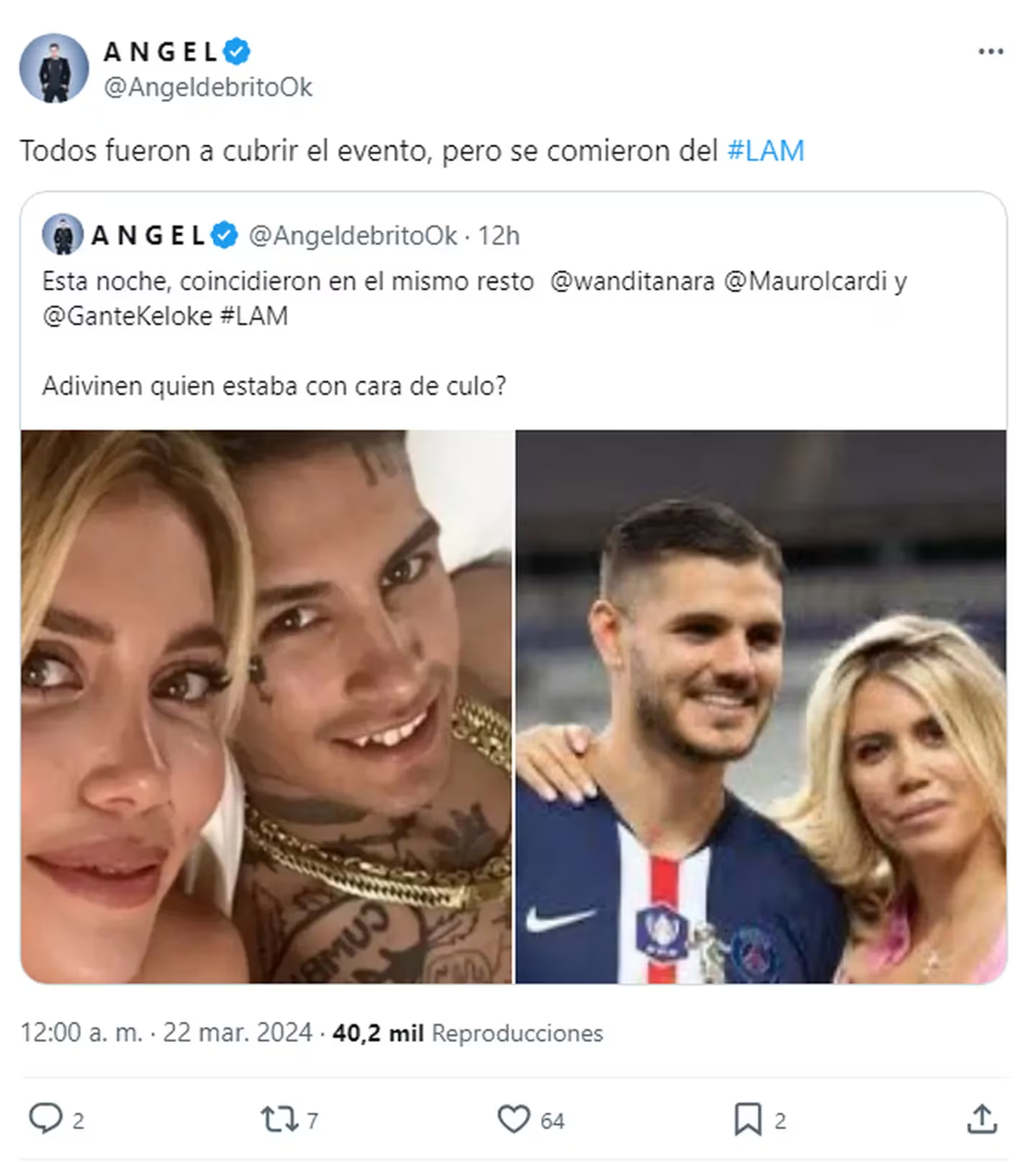 Ángel de Brito compartió en Twitter la foto de ese momento. "Esta noche coincidieron en el mismo restó @wanditanara @mauroicardi y @gantekeloke ¿Adivinen quién estaba con cara de culo", escribió.