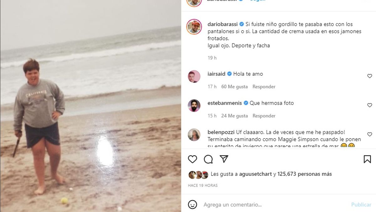 Darío acompañó la imagen retro con una profunda reflexión con su habitual sentido de humor: "Si fuiste niño gordillo te pasaba esto con los pantalones si o si. La cantidad de crema usada en esos jamones frotados. Igual ojo. Deporte y facha", expresó.