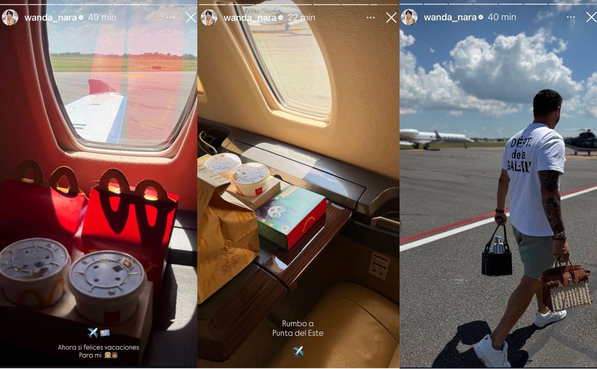 A través de varias publicaciones, la rubia volvió a fotografiar una de las ventillas del avión privado, donde se pueden ver dos combos de comida rápida al que le escribió: "Ahora sí felices vacaciones para mí", junto a los emojis de dos nenas.