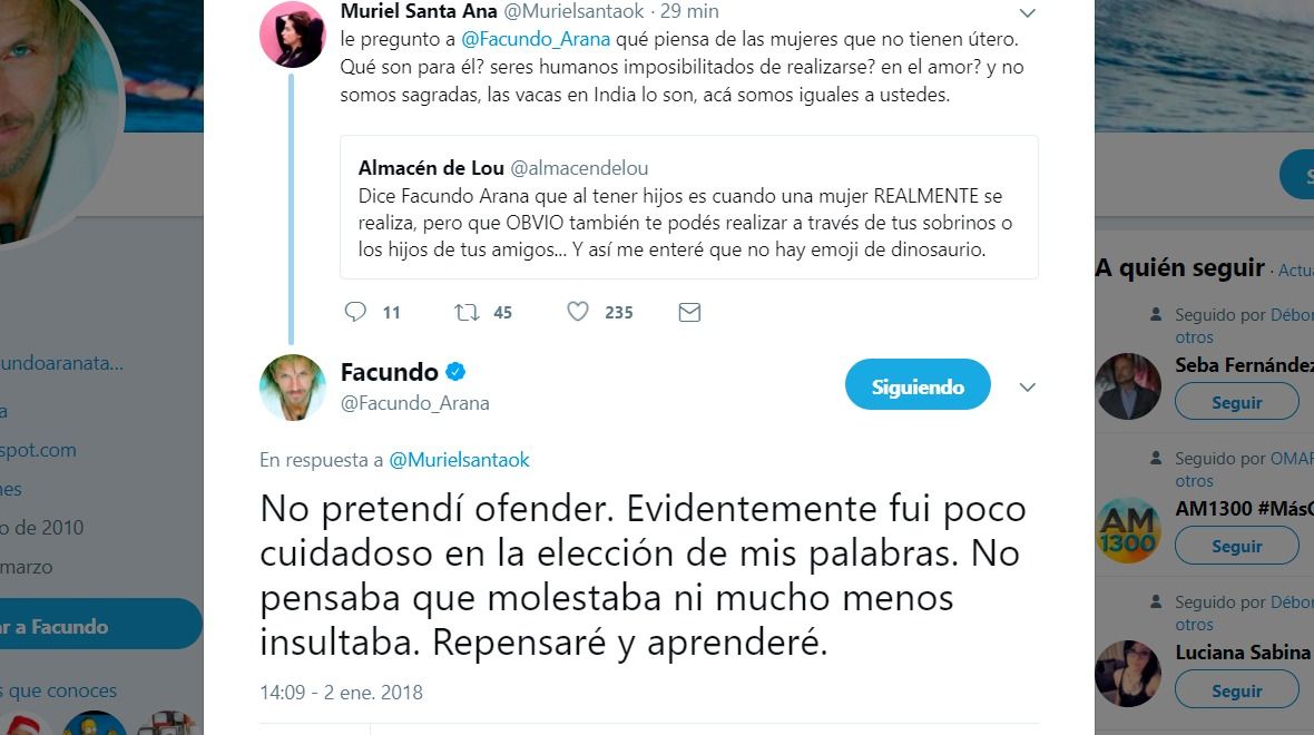 Lo cierto es que esta última frase de Arana molestó a su colega Muriel Santa Ana y a un grupo de feministas: "Le pregunto a @Facundo_Arana qué piensa de las mujeres que no tienen útero. Qué son para él? seres humanos imposibilitados de realizarse? en el amor? y no somos sagradas, las vacas en India lo son, acá somos iguales a ustedes", arrojó la actriz en su cuenta de Twitter.