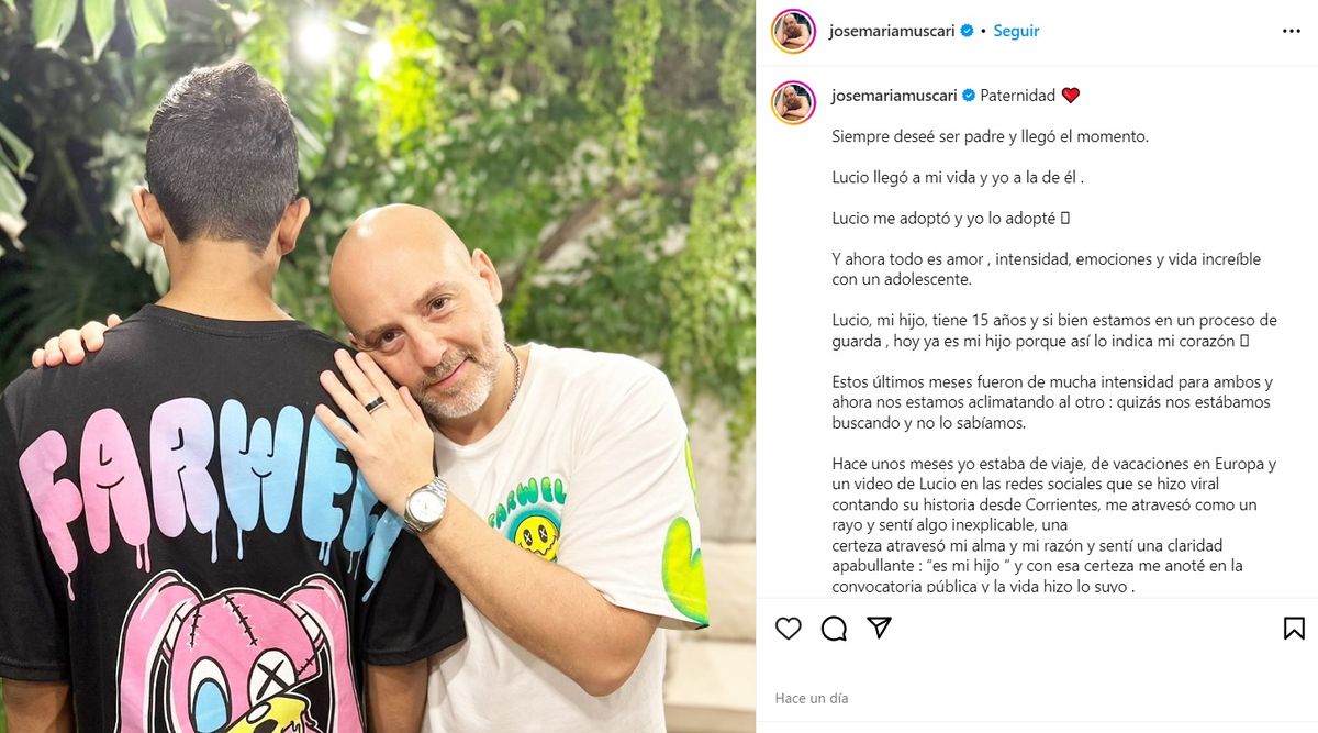 "Paternidad. Siempre deseé ser padre y llegó el momento. Lucio llegó a mi vida y yo a la de él. Lucio me adoptó y yo lo adopté. Y ahora todo es amor , intensidad, emociones y vida increíble con un adolescente", indicó José María Muscari en su mensaje en Instagram al dar a conocer de la historia de su hijo Lucio.