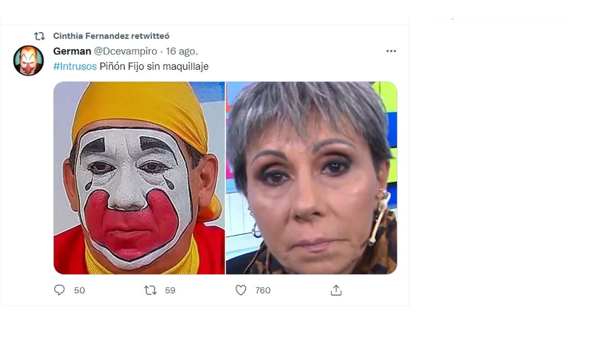 "#Intrusos Piñón sin maquillaje", decía la imagen en la red social donde se veía al famoso payaso y a Frascino. A lo que Fernández reaccionó con una carcajada interminable: "Jajajajajajaajjajajajajajajajajajjasjajjajajajajajajajajajjajajajajajajajajajjajajaja".