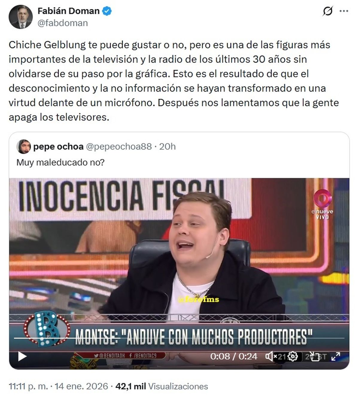 Por su parte, Fabián Doman comentó con más prudencia pero muy crítico de los dichos de Luca: "Chiche Gelblung te puede gustar o no, pero es una de las figuras más importantes de la televisión y la radio de los últimos 30 años sin olvidarse de su paso por la gráfica".