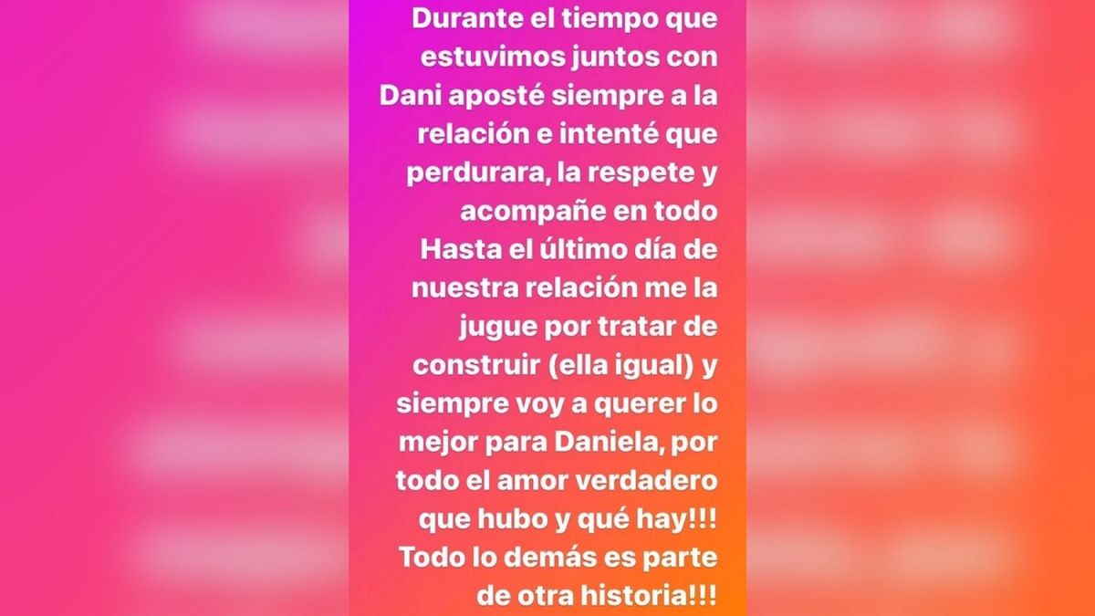 “Hasta el último día de nuestra relación me la jugué por tratar de construir (ella igual) y siempre voy a querer lo mejor para Daniela, ¡por todo el amor verdadero que hubo y hay!”, siguió el exfutbolista, en un posteo que publicó a través de sus stories de Instagram.