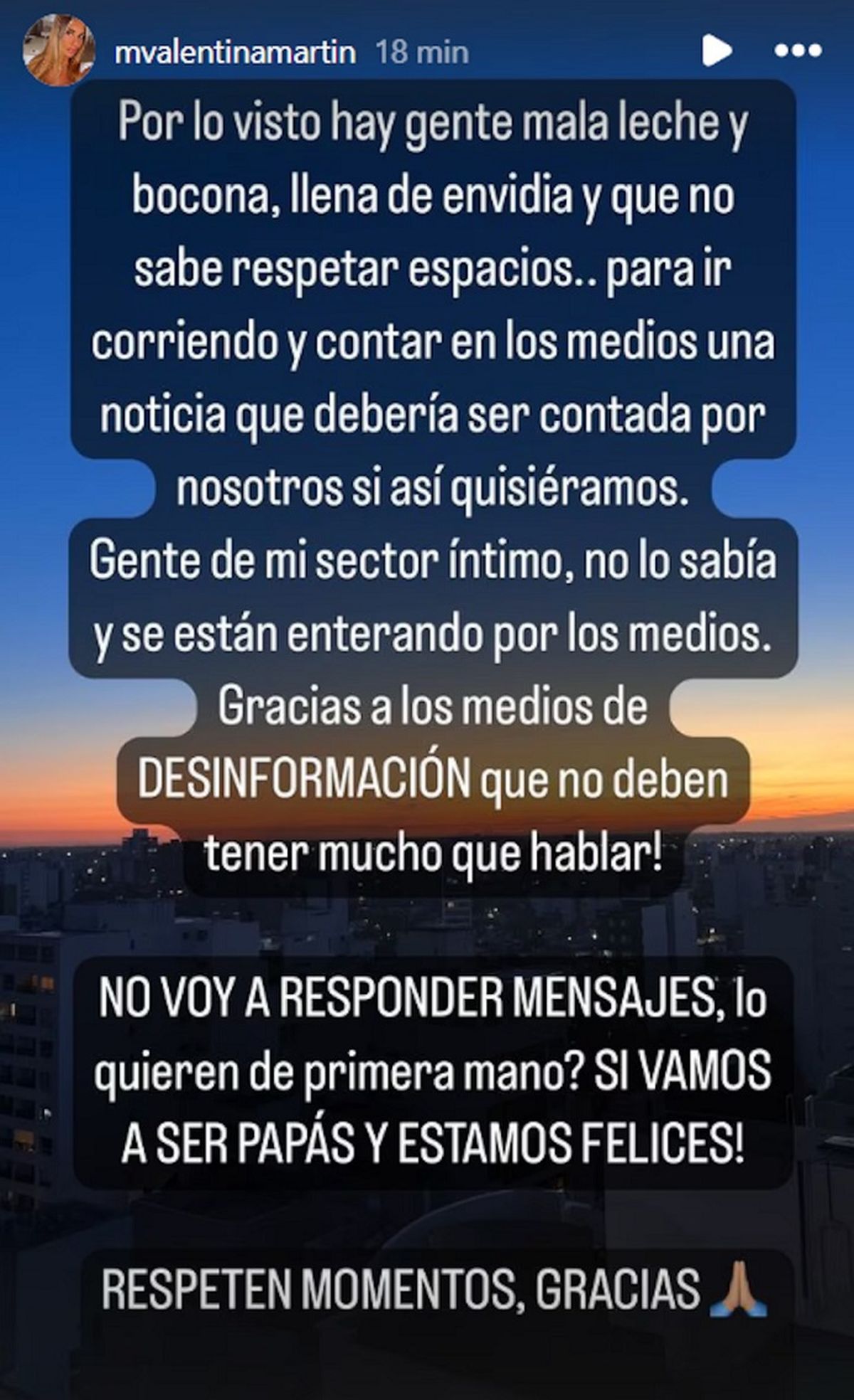 Lo cierto es que Valentina se mostró indignada desde las redes sociales tras la filtración de esta noticia ya que aún no se lo habían contado a varios de sus seres queridos y confirmó que efectivamente esperan su primer bebé y están felices.
