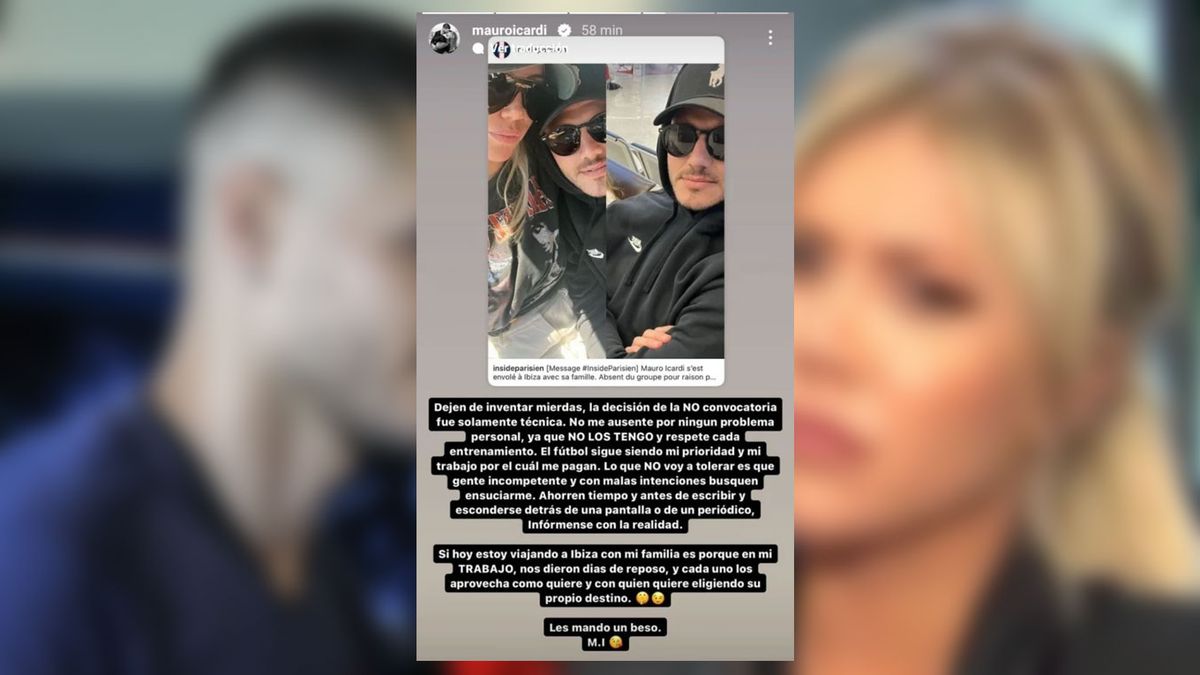 Por último, Icardi precisó que el PSG autorizó su viaje con Wanda y sus hijas. "Si hoy estoy viajando a Ibiza con mi familia es porque en mi TRABAJO nos dieron días de reposo y cada uno los aprovecha como quiere y con quién quiere, eligiendo su propio destino. Les mando un beso”, concluyó.