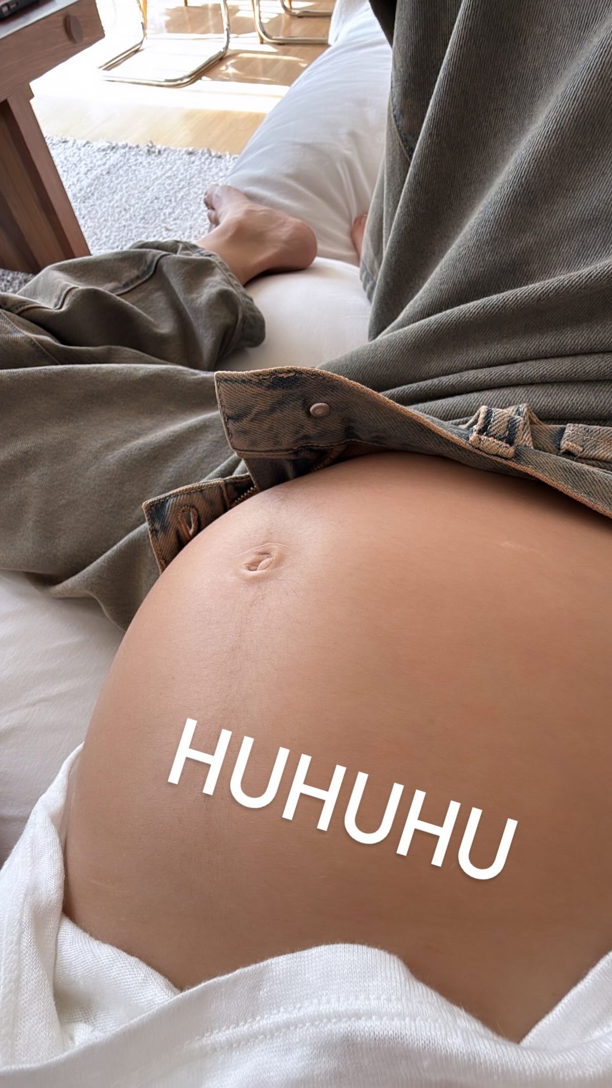 "HUHUHU", escribió junto a la tierna foto donde se la ve recostada en el sillón del living y con su jean sin el botón colocado, dejando apreciar su entusiasmo por esta nueva etapa.