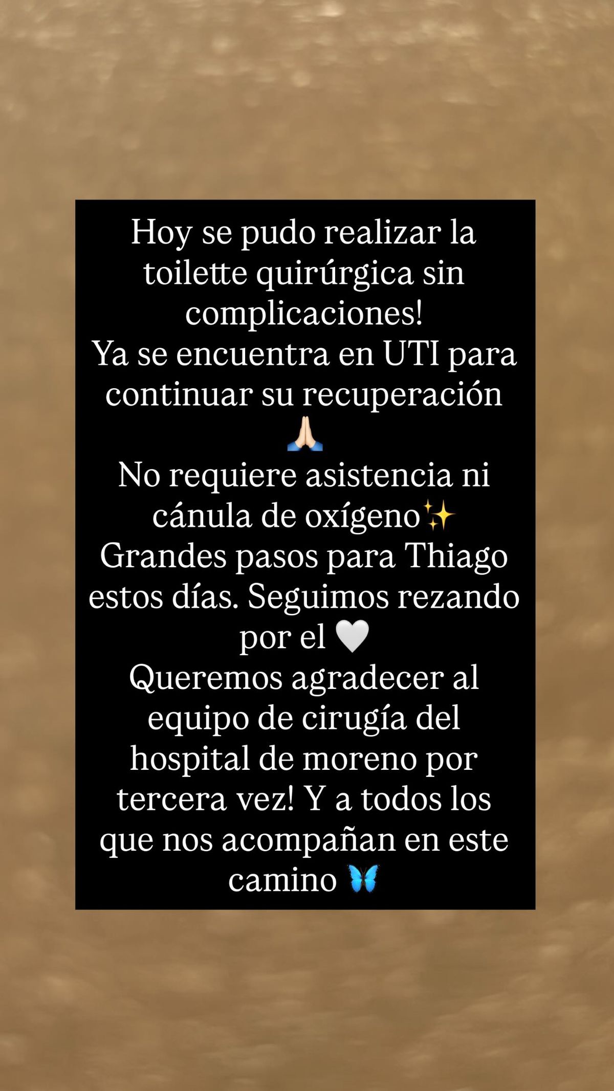 “Hoy se pudo realizar la toilette quirúrgica sin complicaciones. Ya se encuentra en UTI para continuar su recuperación. No requiere asistencia ni cánula de oxígeno. Grandes pasos para Thiago estos días. Seguimos rezando por él”, explicó Pestañela sobre los últimos avances en el cuadro del padre de sus hijas Laia y Aimé.
