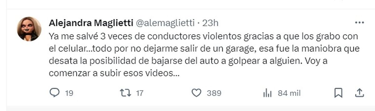 Desde su cuenta de Twitter, Maglietti contó con suma preocupación las situaciones violentas que vivió en reiteradas oportunidades en la vía pública mientras manejaba.