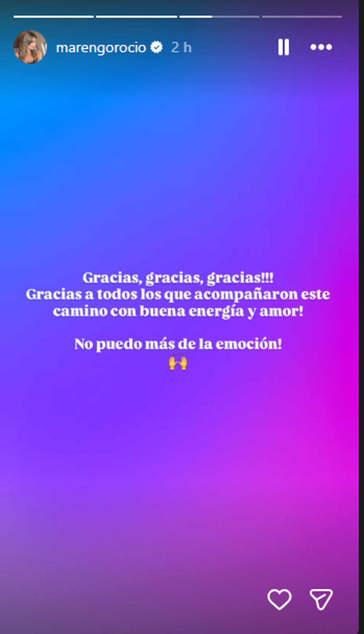"Gracias, gracias, gracias. Gracias a todos los que me acompañaron este camino con buena energía y amor. No puedo más de la emoción", concluyó Marengo en sus historias.