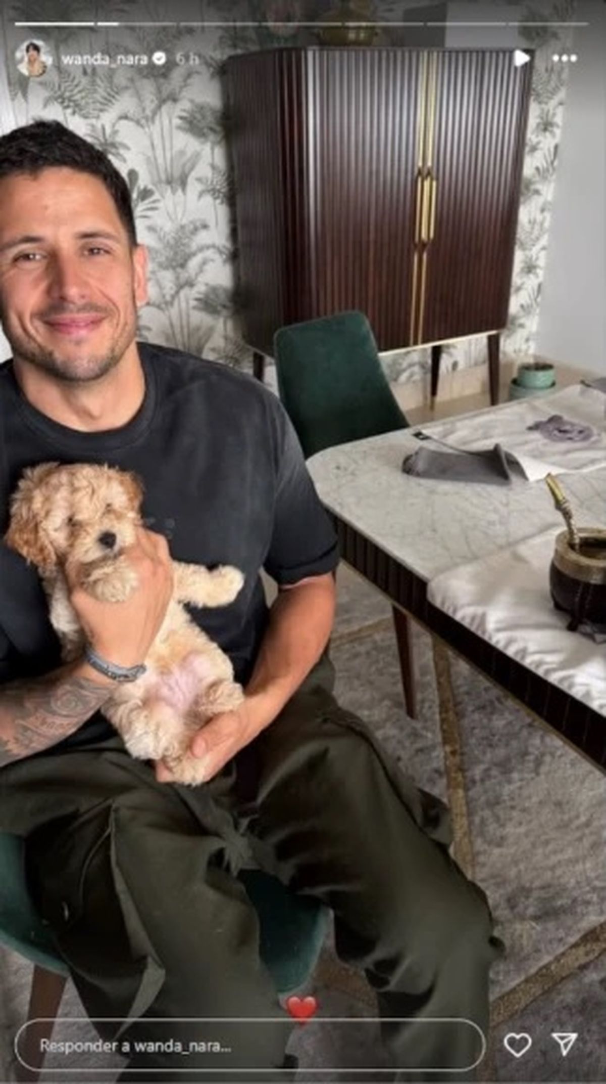 Claro que la tarde en el country de Santa Bárbara dejó varias postales que no pasaron desapercibidas para los fanáticos de la mediática. Así, después de una comida a pura pasta cocinada nada menos que por Donato de Santis, Wanda Nara compartió en sus Instagram Stories una tierna foto de su flamante novio sentado junto a una mesa de mármol blanca, a la que le agregó un corazón rojo. En tanto, el detalle fue sostenía en sus brazos un cachorrito que descansaba en sus brazos.