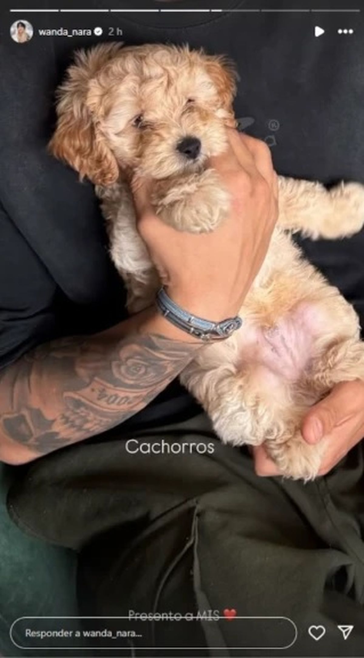 Asimismo, en otro posteo Wanda Nara mostró nuevamente al perrito a upa de Migueles descansando, en el que se limitó a escribir la palabra "Cacharros" en el centro de la postal, mientras que al pie de la foto agregó: "Presente a MIS" junto a otro corazón rojo para anunciar a sus flamantes amores.