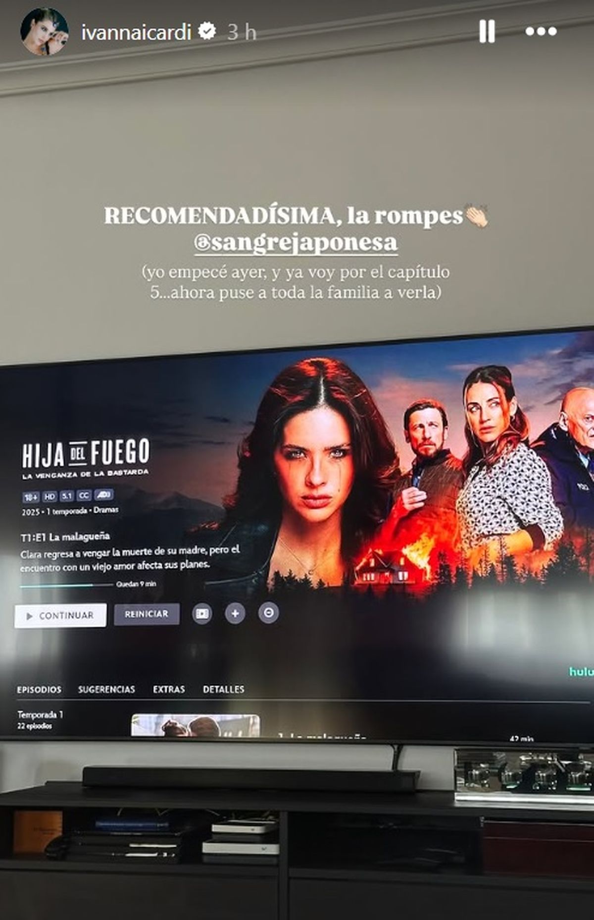 “Recomendadísima, la rompés @sangrejaponesa. Yo empecé ayer y ya voy por el capítulo 5... Ahora puse a toda la familia a verla”, escribió Ivana Icardi con un emoji de aplauso en la postal donde muestra su televisor observando la serie de la China Suárez.