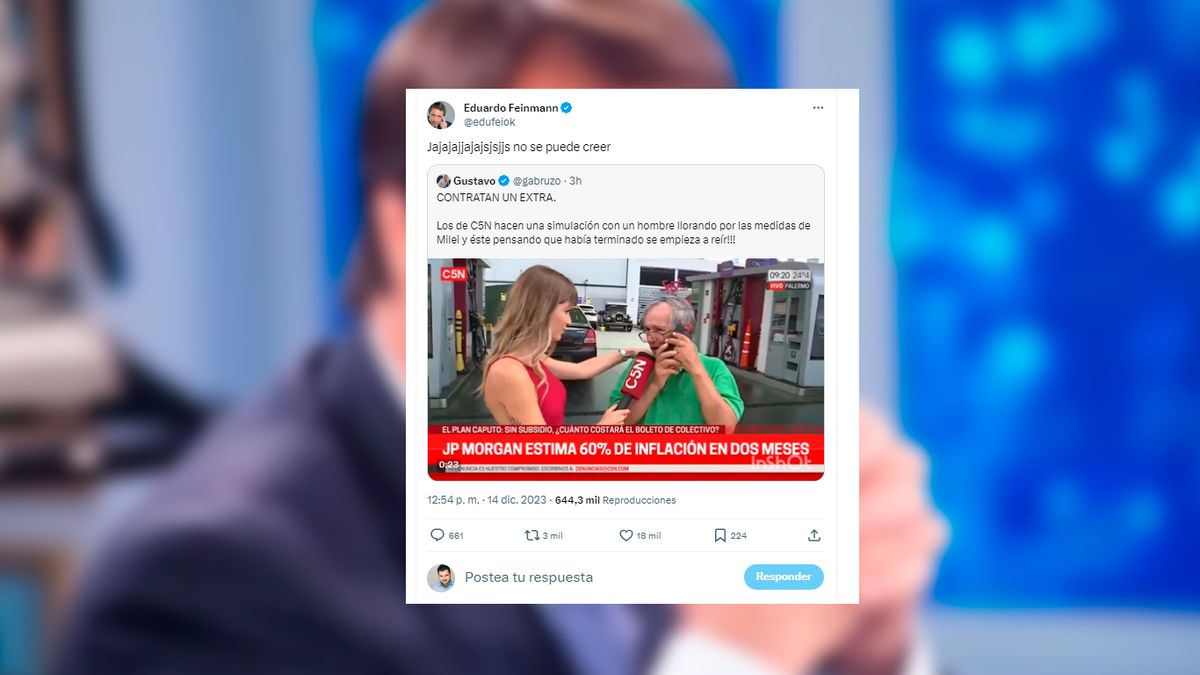 El video de la "falsa entrevista" se volvió viral. En su cuenta de Twitter, el periodista Eduardo Feinmann reaccionó indignado al ver la escena. "JaJaJa No se puede creer", exclamó el conductor de LN+ al compartir ese fragmento.